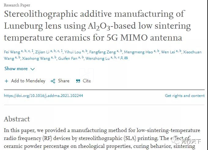 近日,國際權威雜志《增材制造》(Additive Manufacturing, IF:10.998)在線刊發(fā)了華中科技大學光學與電子信息學院呂文中教授團隊最新研究成果《3D打印低溫燒結5G MIMO陶瓷龍勃透鏡天線》(Stereolithographic additive manufacturing of Luneburg lens using Al2O3-based low sintering temperature ceramics for 5G MIMO antenna. DOI:10.1016/j.addma.2021.102244)。博士生王飛,碩士生李子健為論文共同一作,呂文中為論文通訊作者。